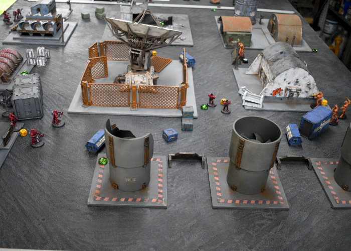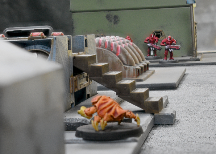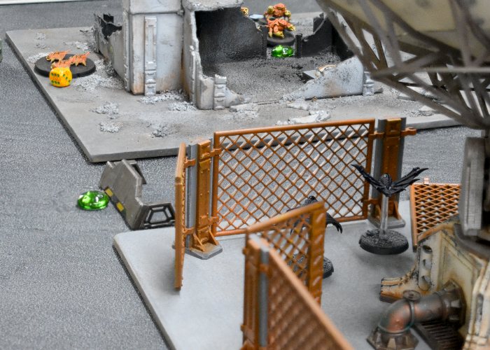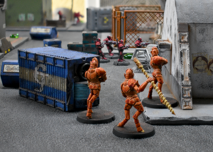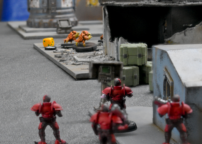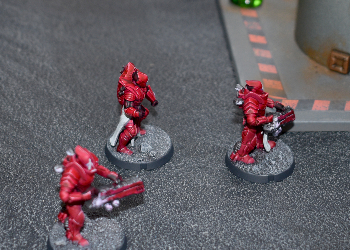 Attempting to get away from the Minnows' attack, the Tamakin shuffled towards the back of the Karist deployment zone, Taking Cover behind the trash unit. Their refuge turned out to be short lived, however, as the Tempests were able to Dash back to draw a bead on the cowering thralls. With the Nova's gauntlet out of range, the Tempests' Ravager Cannon shots were blocked by cover, but did manage to raise the Tamakins' suppression level.