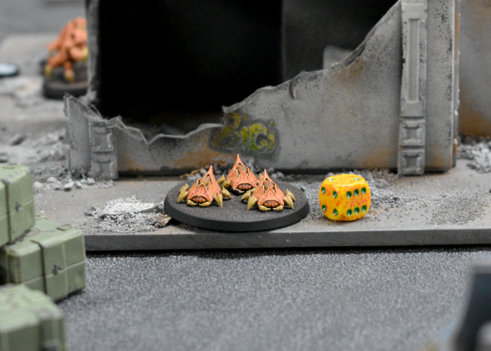Heading into the final turn, the Kaigus Pact once again won Priority. The Attendants moved forward to bring the lone Assault Squad trooper back into line of sight. As the Trooper fell to a hail of poisoned darts, the Biologis troops expended two command points to spawn another unit of Shatter Thralls to help control their side of the battlefield.