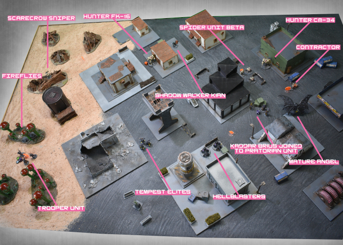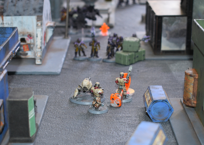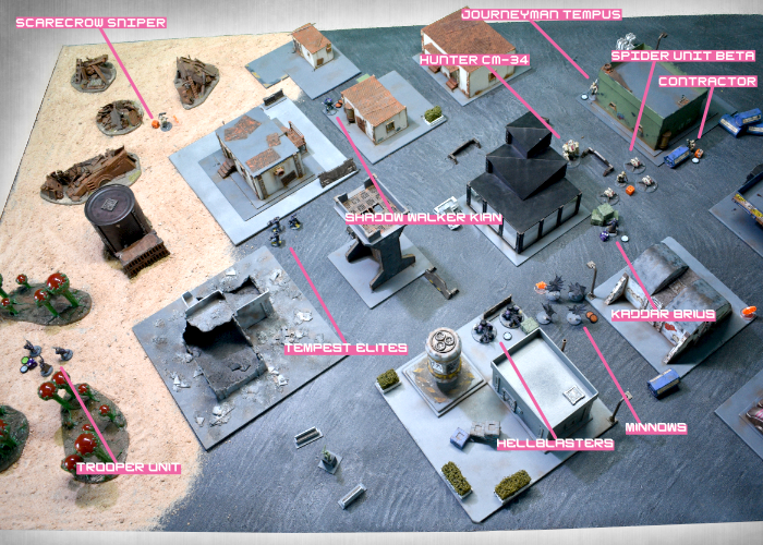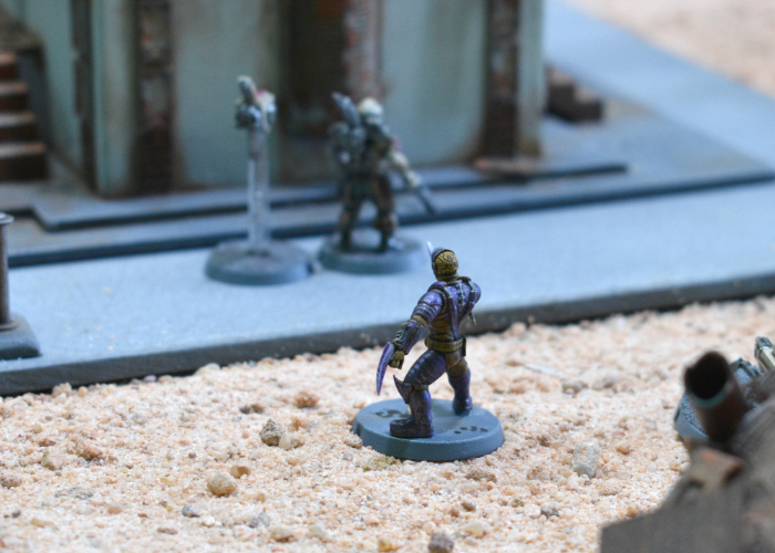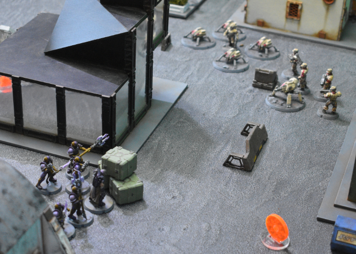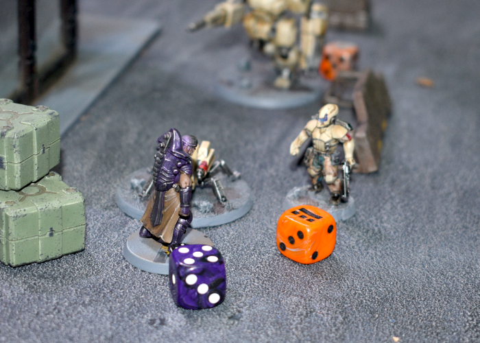 Activating his comm, Kaddar Brius ordered Kian to ignore his injuries, spending two command points to drop the Shadow Walker back down to suppression level 0. The Praetorian bodyguard advanced with the Kaddar Nova, moving in behind some crates on the corner of the Foundation offices. Taking aim at the Contractor unit the hail of pulse rounds and blasts from the Nova's gauntlet dropped two of the Contractors, with the Gauntlet's Shock pushing them up to suppression level 4. Shadow Walker Kian took his cue to move in, creating a Rift to drop in behind the second Epirian Journeyman. Journeyman Barnel's corporate-issue armor blocked two hits, but was unable to stop the well-aimed Critical hit. With the Journeyman's lifeless body falling to the tarmac, the Epirian force was left with no leadership and the battle was just getting started...