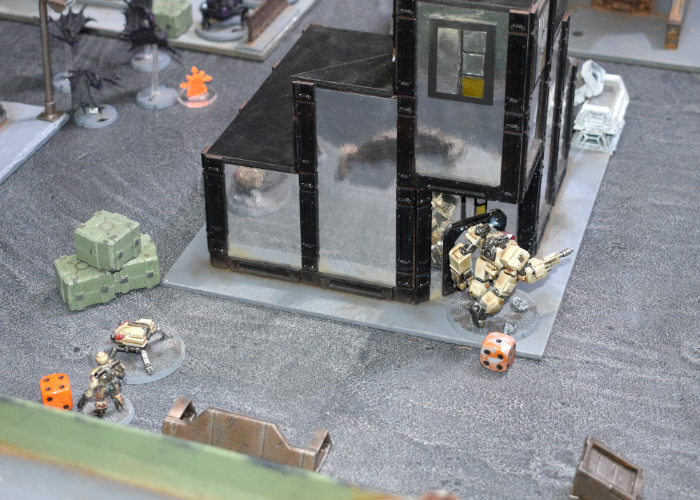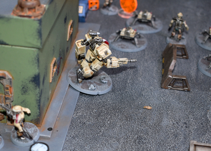 Continuing the Karist advance, the Tempest Elites moved up to bring their Coriolis launchers into range against the Spider drone unit backing up the Scarecrow. The massed hail of artillery fire was too much for the fragile drones, eliminating all of the spiders and their Apprentice Handler, leaving the Dig marker they had been guarding wide open. The Hellblasters also moved up, taking up a position behind a streetside barricade. Sighting in on Hunter FK-16, their energy blasts seared across the battlefield, rocking the massive bot. All but one of the blasts was blocked by the warmech's heavy armor, however, raising it to suppression level 2, but keeping it in the action.