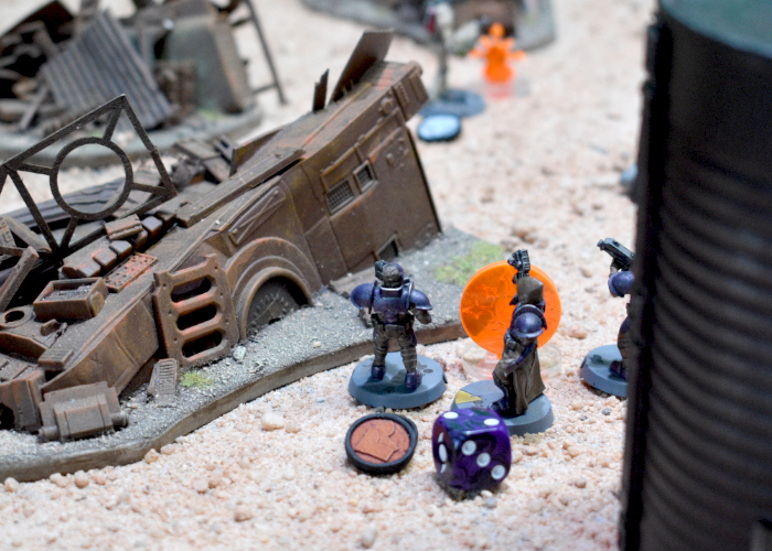 On the outpost's boundary, the Epirian Fireflies zipped up into the fungus forest around the Karist Trooper-controlled Dig marker. Two of the little drones missed completely, but the third wounded and killed one of the troopers, the Beam passing through him and taking out a second trooper as well, raising the Troopers' suppression level to 2. Meanwhile, Hunter FK-16 advanced up the laneway between buildings, taking aim at Shadow Walker Kian, seeking to take him out before he replicated Vidien's maneuver on the forces remaining Journeyman. The Shadow Walker Dodged through the fusillade of flakk cannon and cluster missile fire, but emerged having taken two wounds, dropping him to FOR 1 and raising his suppression level to 2.