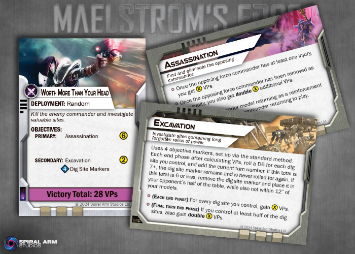 The mission for this battle is Worth More Than Your Head, which uses the Assassination and Excavation Objectives. Iain, playing the Epirian Foundation, selected the Master of Machines Faction Objective, while Michael, playing the Karists, selected First Contact. The Karists are the attackers, and deployment is using the Pincer map, which leaves an angled 12-24" space between the opposing deployment zones, wider in the middle than the edges.