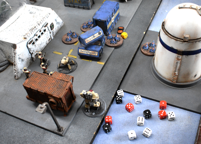 Hunter FK-16 lurched into motion, moving forward and spraying the diminutive thrall swarm with suppressive fire. While Suppressive Fire does no immediate damage, this successfully bumped the swarm up to suppression level 2. The nearby Contractor Defender squad chose to take a more direct approach, advancing around the corner, taking aim and firing on the swarm to full effect. Three critical hits from grenade launchers and a single successful pistol shot saw one base of thralls removed as casualties, 2 injuries on the next, and their suppression increased two more levels.