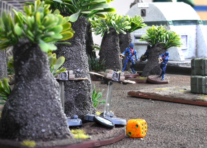 On the opposite flank, the Muharis Sentinel unit dashed across to the nearest forest clump, laying down suppressive fire on the scouting Firefly drones. The Fireflies failed their WP test for both successful hits, raising their suppression level to 3.