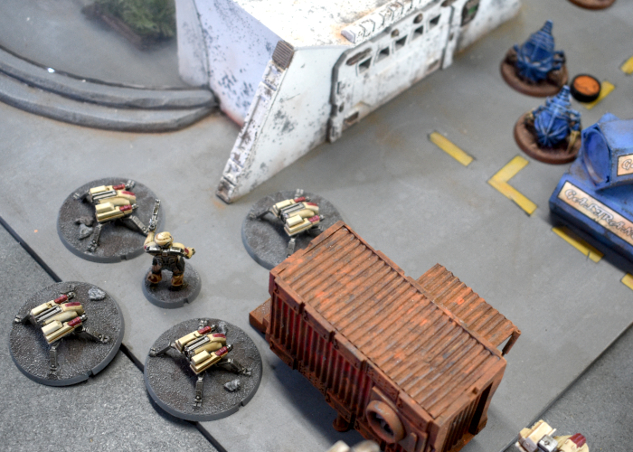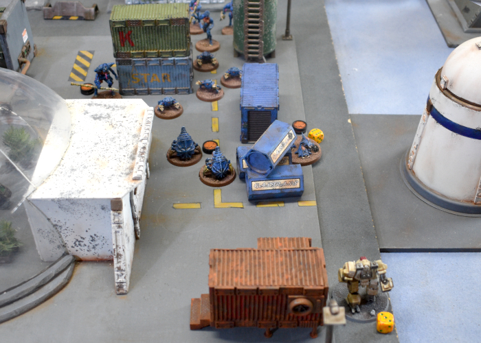 On the other flank, the Fireflies dashed across to the roundyard, snapping out laser shots at the Muharis but missing. Curator Melrahb responded, moving up to the corner of the storage tank he was sheltered behind and shooting a blast at the Epirian flyers with his genostaff. Although the nimble drones were able to Dodge one injury, one drone went down and their suppression level went up two points. Melrahb then spent a command point to bring the reserve Tamakin unit onto the field via Hypergenesis, namites streaming out and building the thralls from base materials in front of the roundyard.