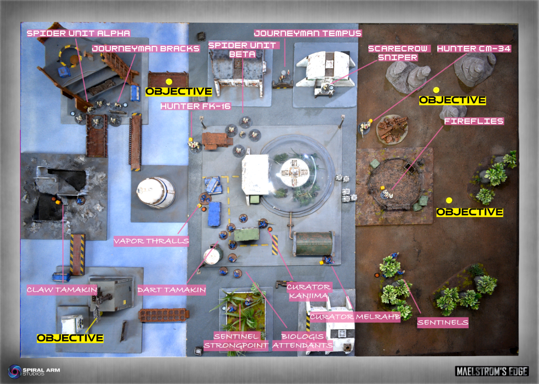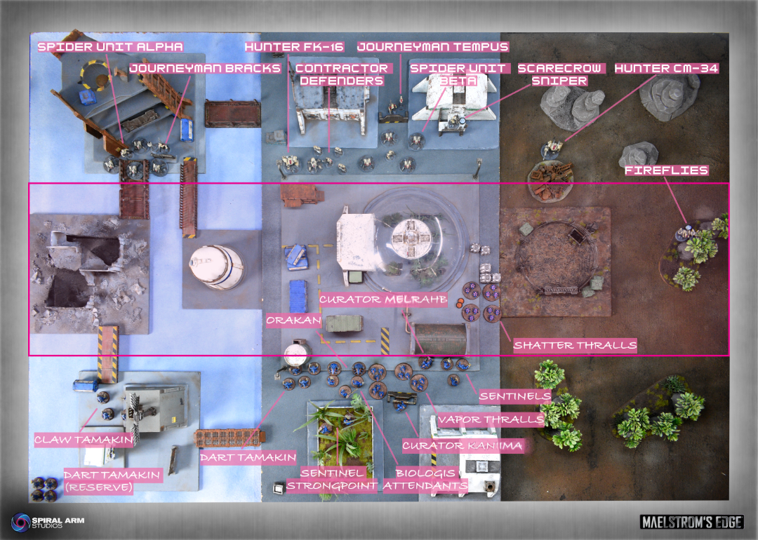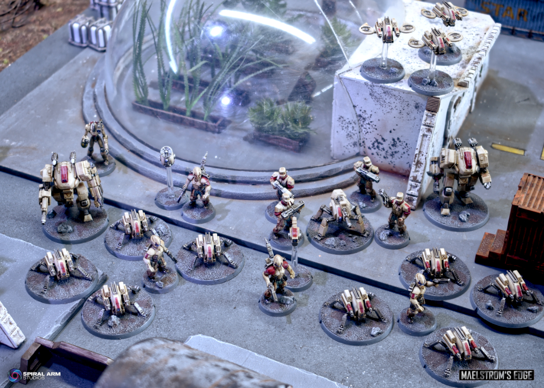 On its raised balcony, the Scarecrow Sniper took aim on the Shatter Thralls scuttling behind the hydroponics facility, a critical hit from its maglock Railrifle taking out one base of the critters. The resultant explosion raised the suppression levels of both Curator Kaniima and the Epirian Firefly unit two points, taking out another Firefly from suppression damage.